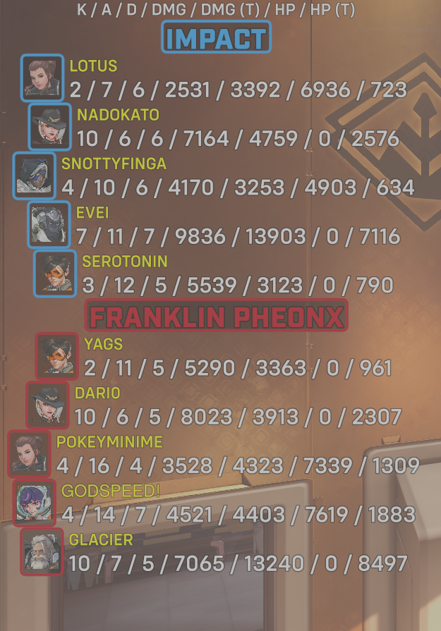 10 entries| Team | Player | Kills | Assists | Deaths | Damage | Damage (Taken) | Healing | Healing (Taken) |
