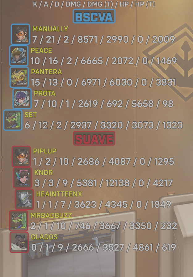 10 entries| Team | Player | Kills | Assists | Deaths | Damage | Damage (Taken) | Healing | Healing (Taken) |