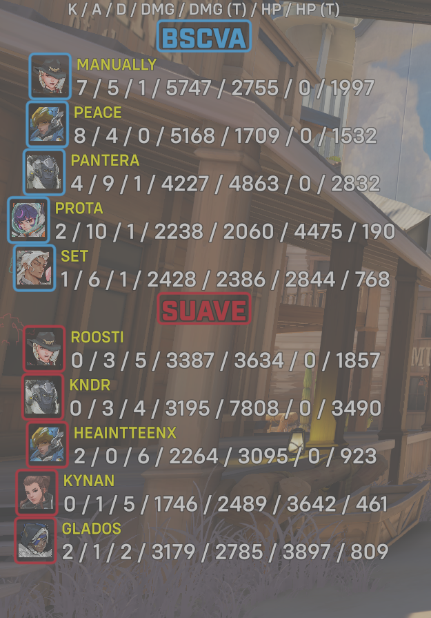 10 entries| Team | Player | Kills | Assists | Deaths | Damage | Damage (Taken) | Healing | Healing (Taken) |