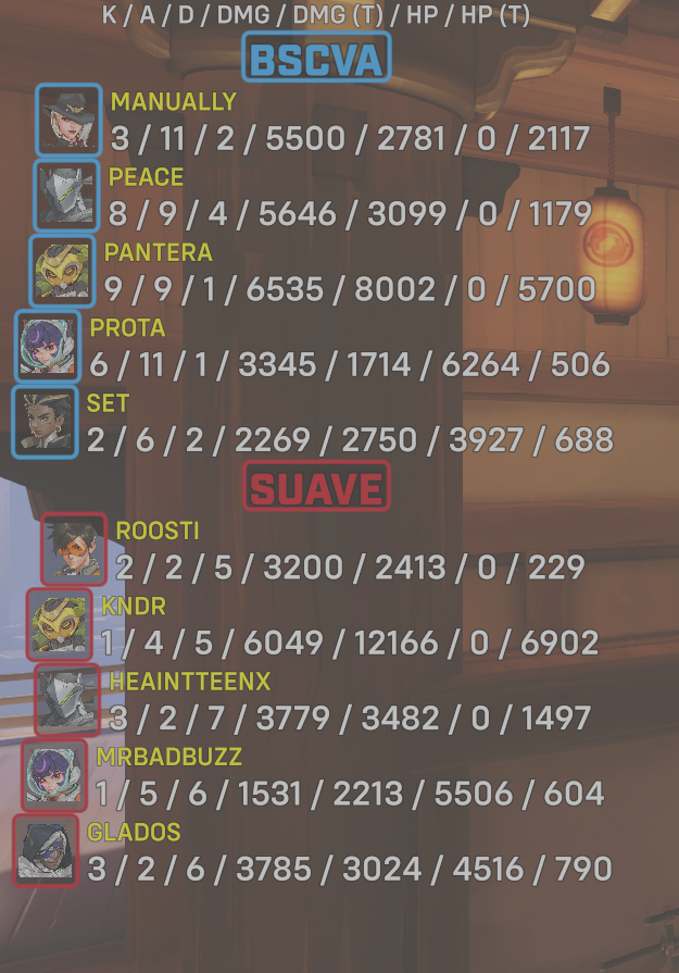 10 entries| Team | Player | Kills | Assists | Deaths | Damage | Damage (Taken) | Healing | Healing (Taken) |