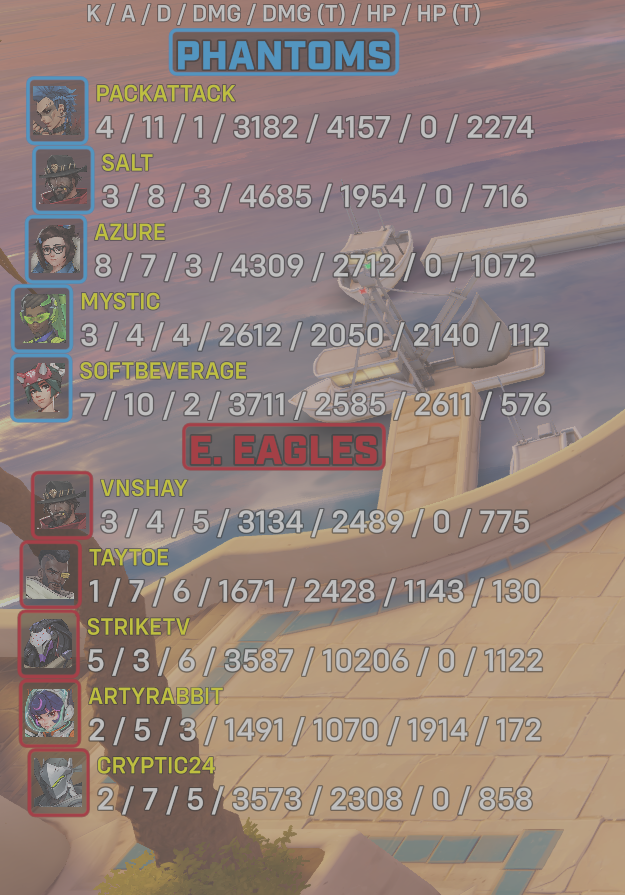 | Team | Player | Kills | Assists | Deaths | Damage | Damage (Taken) | Healing | Healing (Taken) |