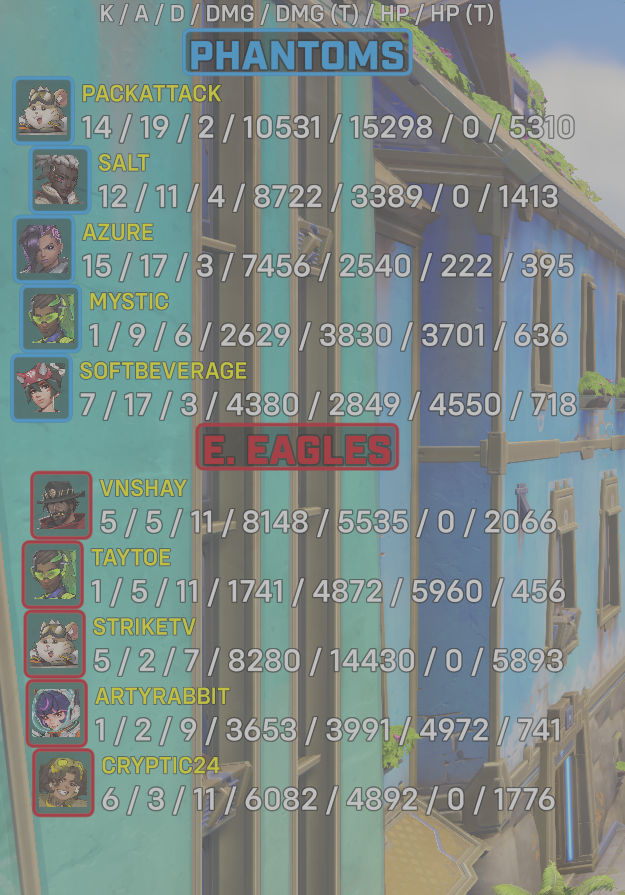 | Team | Player | Kills | Assists | Deaths | Damage | Damage (Taken) | Healing | Healing (Taken) |