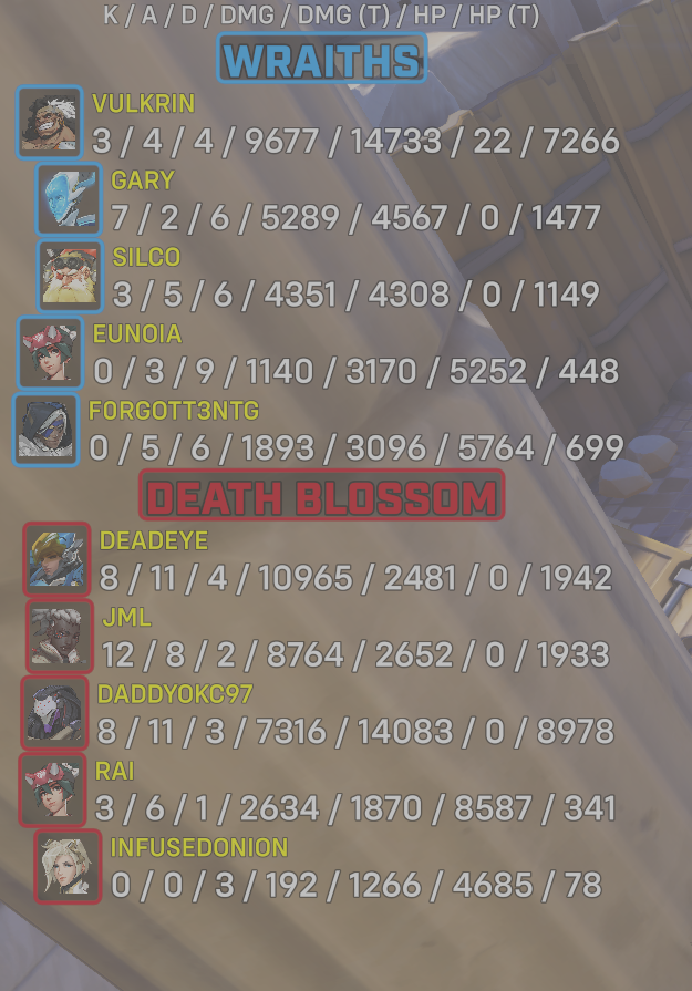 | Wraiths | Gary#14238 | 7 | 2 | 6 | 5289 | 4567 | 0 | 1477 |