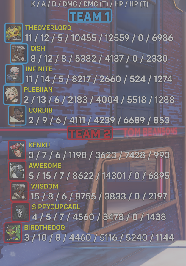 10 entries| Team | Player | Kills | Assists | Deaths | Damage | Damage (Taken) | Healing | Healing (Taken) |