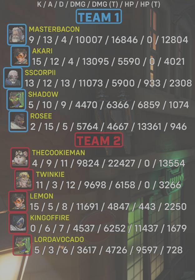 6 entries| Team | Player | Kills | Assists | Deaths | Damage | Damage (Taken) | Healing | Healing (Taken) |