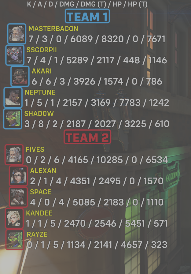 10 entries| Team | Player | Kills | Assists | Deaths | Damage | Damage (Taken) | Healing | Healing (Taken) |
