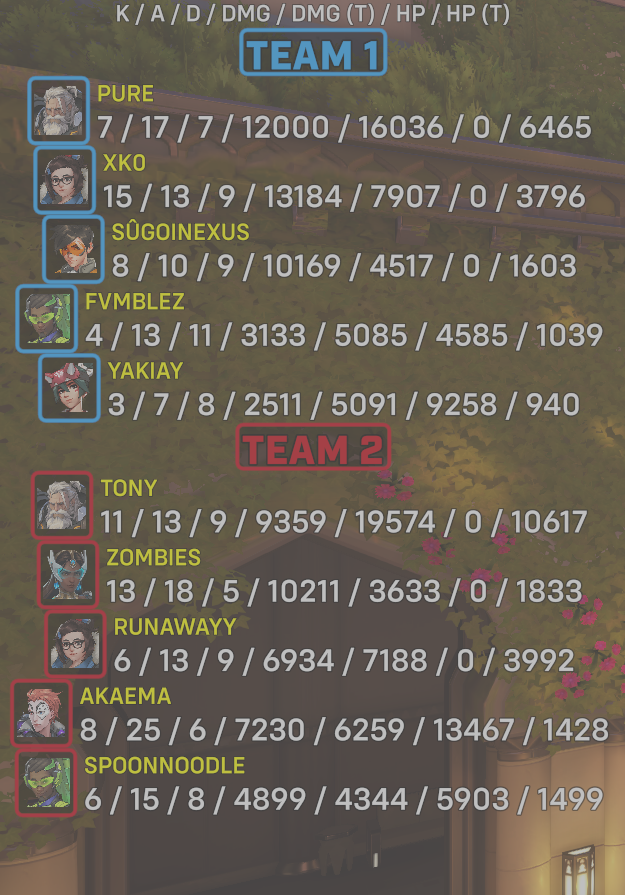 10 entries| Team | Player | Kills | Assists | Deaths | Damage | Damage (Taken) | Healing | Healing (Taken) |