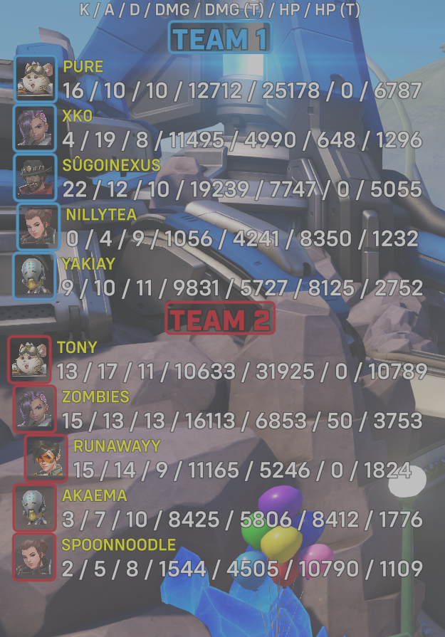 10 entries| Team | Player | Kills | Assists | Deaths | Damage | Damage (Taken) | Healing | Healing (Taken) |