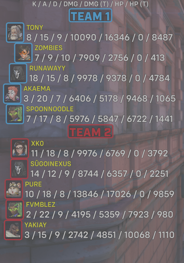 10 entries| Team | Player | Kills | Assists | Deaths | Damage | Damage (Taken) | Healing | Healing (Taken) |