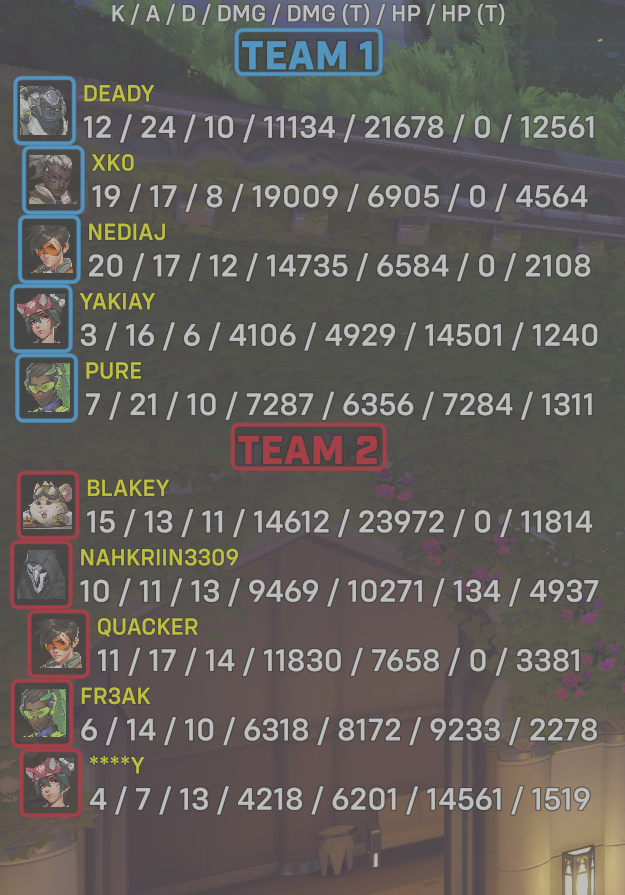 10 entries| Team | Player | Kills | Assists | Deaths | Damage | Damage (Taken) | Healing | Healing (Taken) |