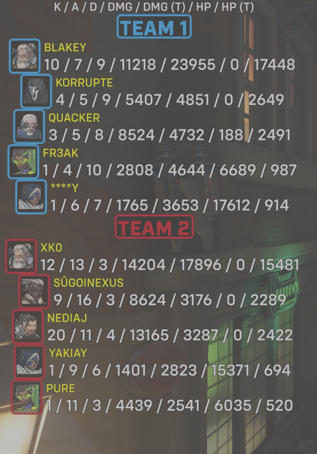8 entries| Team | Player | Kills | Assists | Deaths | Damage | Damage (Taken) | Healing | Healing (Taken) |