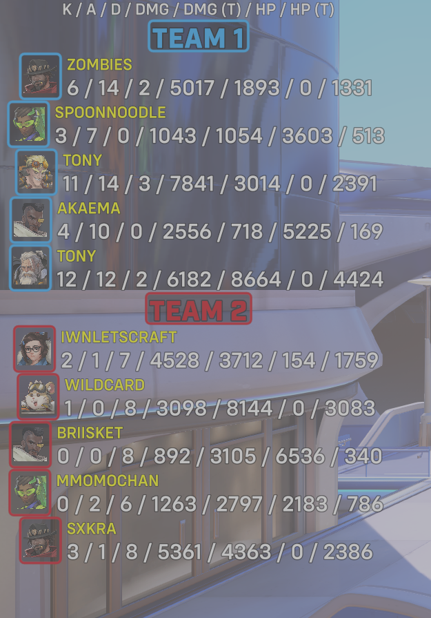 9 entries| Team | Player | Kills | Assists | Deaths | Damage | Damage (Taken) | Healing | Healing (Taken) |