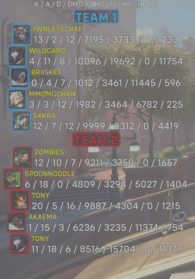 9 entries| Team | Player | Kills | Assists | Deaths | Damage | Damage (Taken) | Healing | Healing (Taken) |