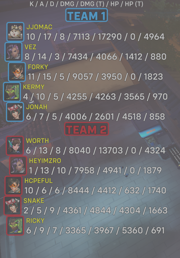 6 entries| Team | Player | Kills | Assists | Deaths | Damage | Damage (Taken) | Healing | Healing (Taken) |