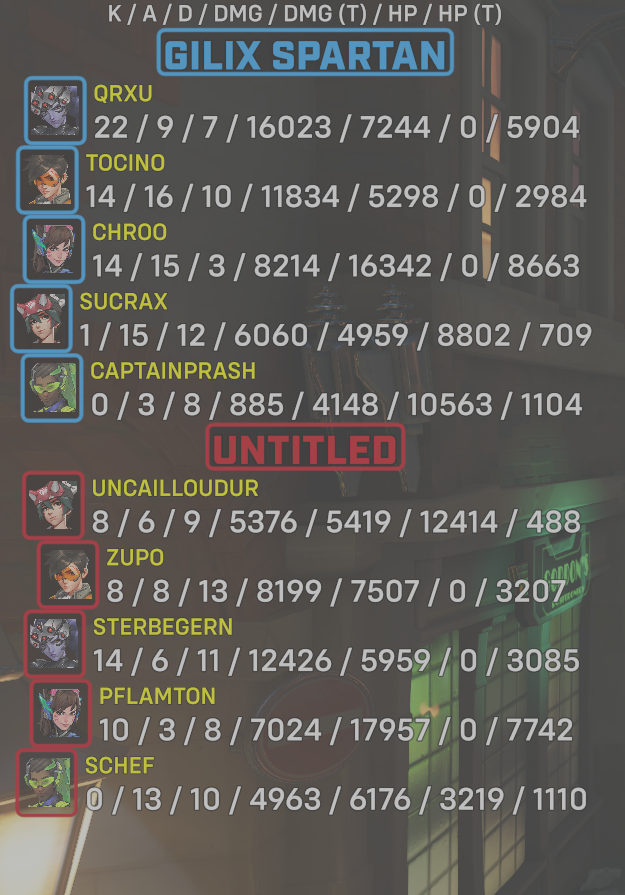 10 entries| Team | Player | Kills | Assists | Deaths | Damage | Damage (Taken) | Healing | Healing (Taken) |