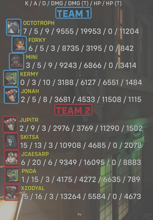 7 entries| Team | Player | Kills | Assists | Deaths | Damage | Damage (Taken) | Healing | Healing (Taken) |