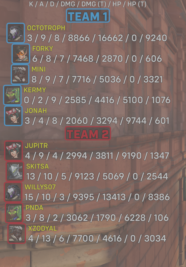 10 entries| Team | Player | Kills | Assists | Deaths | Damage | Damage (Taken) | Healing | Healing (Taken) |