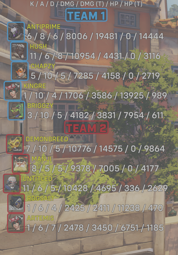 9 entries| Team | Player | Kills | Assists | Deaths | Damage | Damage (Taken) | Healing | Healing (Taken) |