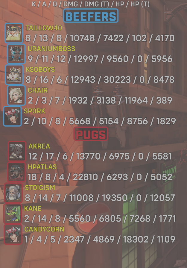 10 entries| Team | Player | Kills | Assists | Deaths | Damage | Damage (Taken) | Healing | Healing (Taken) |