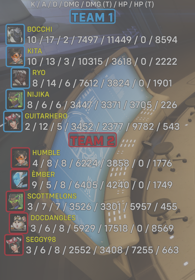 10 entries| Team | Player | Kills | Assists | Deaths | Damage | Damage (Taken) | Healing | Healing (Taken) |
