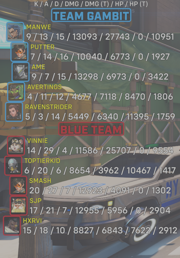 10 entries| Team | Player | Kills | Assists | Deaths | Damage | Damage (Taken) | Healing | Healing (Taken) |