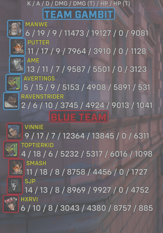 10 entries| Team | Player | Kills | Assists | Deaths | Damage | Damage (Taken) | Healing | Healing (Taken) |
