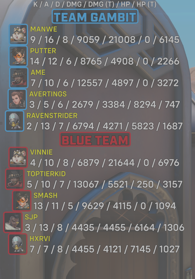 10 entries| Team | Player | Kills | Assists | Deaths | Damage | Damage (Taken) | Healing | Healing (Taken) |