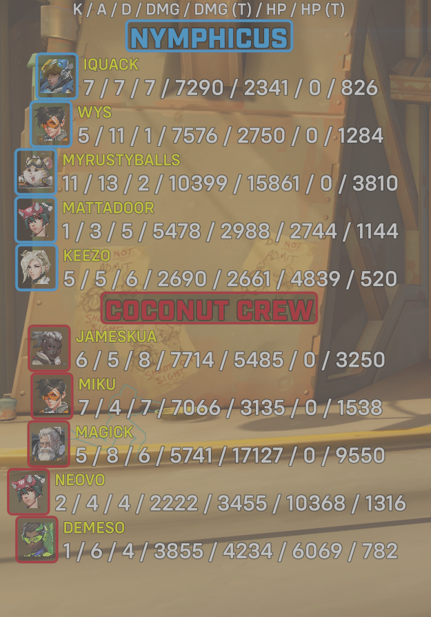 8 entries| Team | Player | Kills | Assists | Deaths | Damage | Damage (Taken) | Healing | Healing (Taken) |