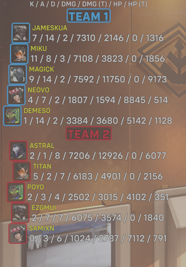 9 entries| Team | Player | Kills | Assists | Deaths | Damage | Damage (Taken) | Healing | Healing (Taken) |