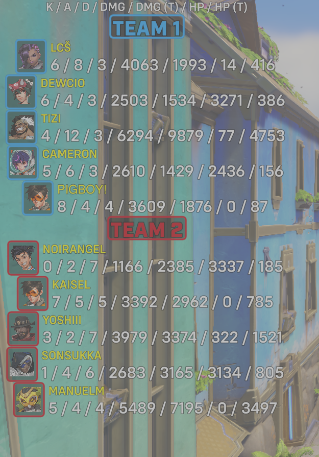 | Team | Player | Kills | Assists | Deaths | Damage | Damage (Taken) | Healing | Healing (Taken) |