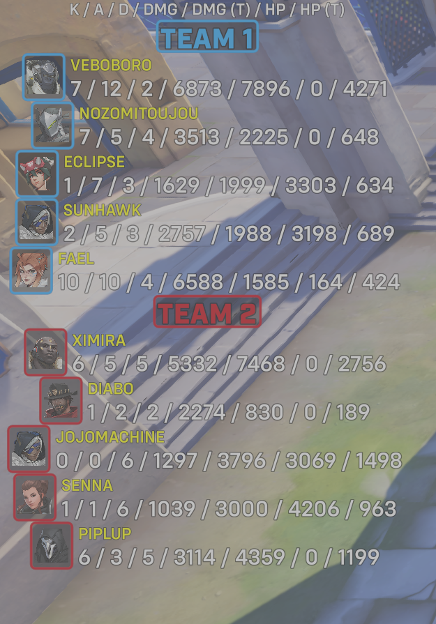 | Team | Player | Kills | Assists | Deaths | Damage | Damage (Taken) | Healing | Healing (Taken) |