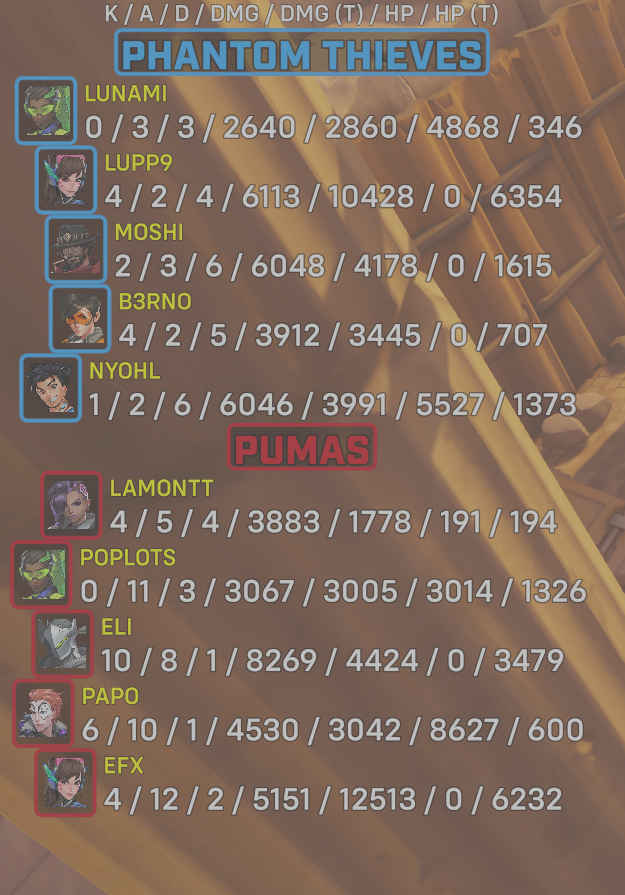 | Team | Player | Kills | Assists | Deaths | Damage | Damage (Taken) | Healing | Healing (Taken) |