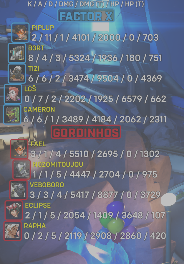 | Team | Player | Kills | Assists | Deaths | Damage | Damage (Taken) | Healing | Healing (Taken) |