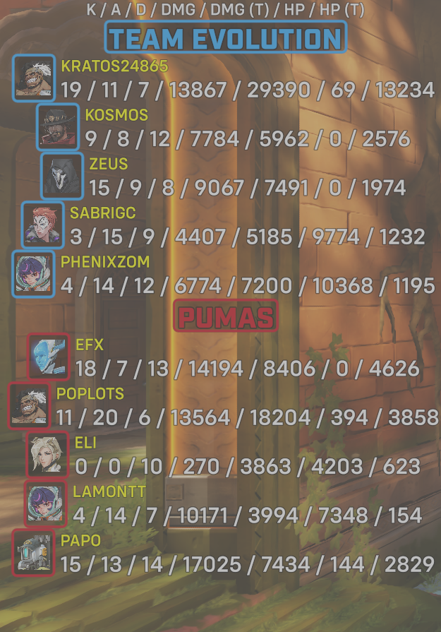 | Team | Player | Kills | Assists | Deaths | Damage | Damage (Taken) | Healing | Healing (Taken) |