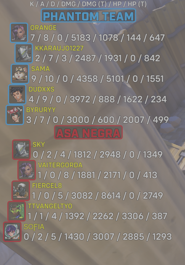 | Phantom Team | Sama#11600 | 9 | 10 | 0 | 4358 | 5101 | 0 | 1551 |