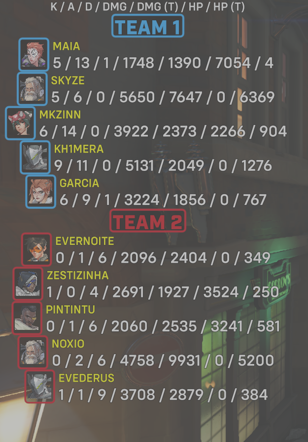 | Team | Player | Kills | Assists | Deaths | Damage | Damage (Taken) | Healing | Healing (Taken) |