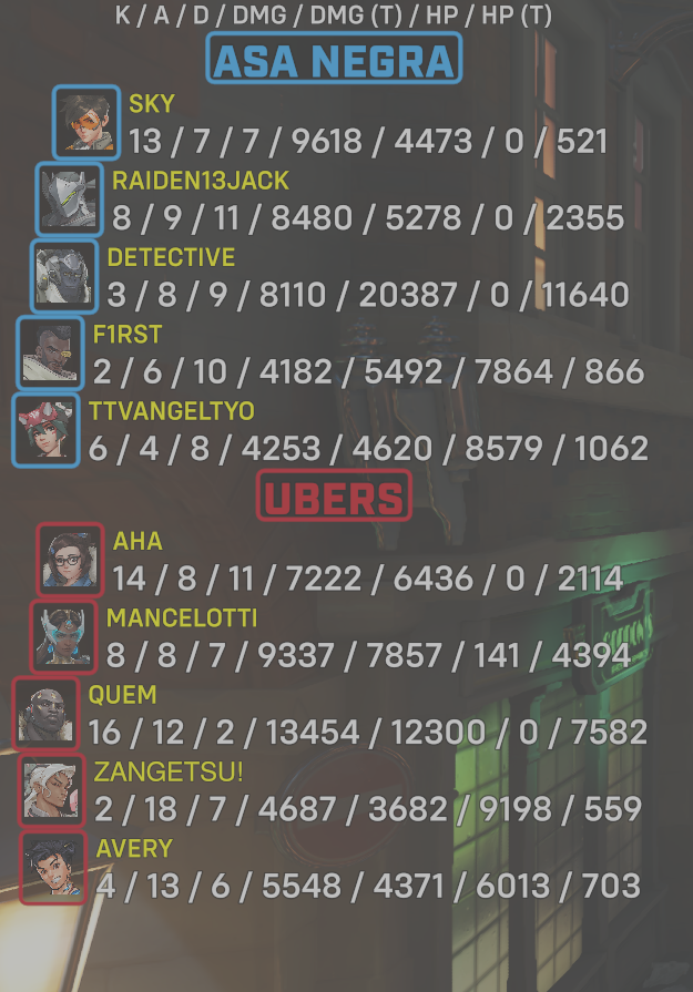 | Team | Player | Kills | Assists | Deaths | Damage | Damage (Taken) | Healing | Healing (Taken) |
