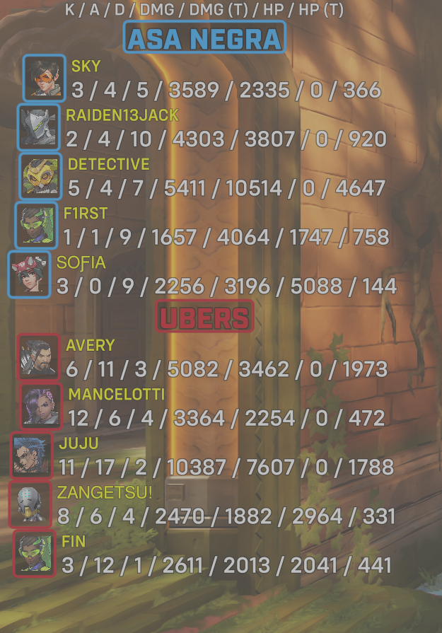 | Team | Player | Kills | Assists | Deaths | Damage | Damage (Taken) | Healing | Healing (Taken) |
