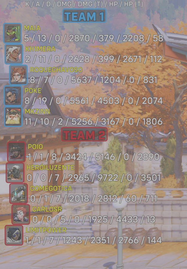 | Team | Player | Kills | Assists | Deaths | Damage | Damage (Taken) | Healing | Healing (Taken) |