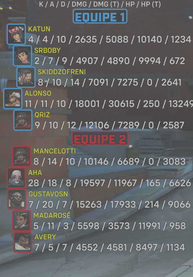 | Team | Player | Kills | Assists | Deaths | Damage | Damage (Taken) | Healing | Healing (Taken) |