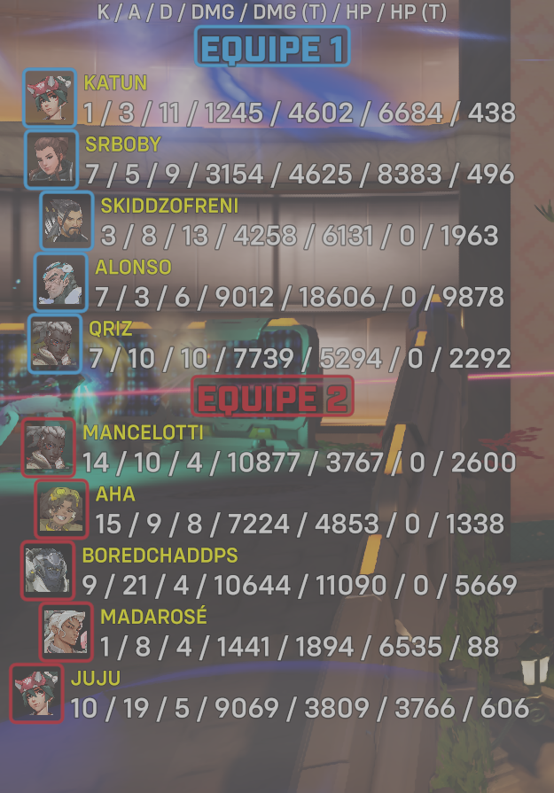 | Team | Player | Kills | Assists | Deaths | Damage | Damage (Taken) | Healing | Healing (Taken) |