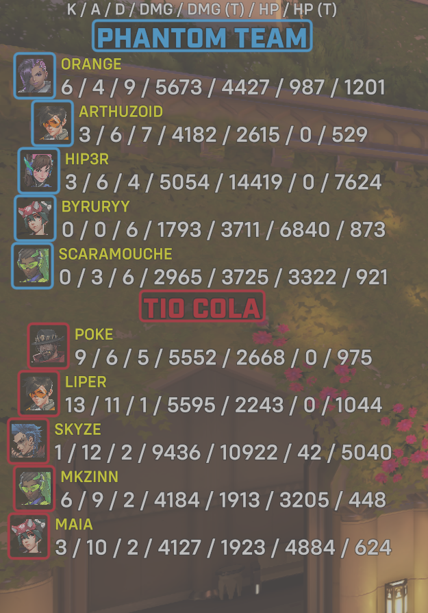 | Team | Player | Kills | Assists | Deaths | Damage | Damage (Taken) | Healing | Healing (Taken) |