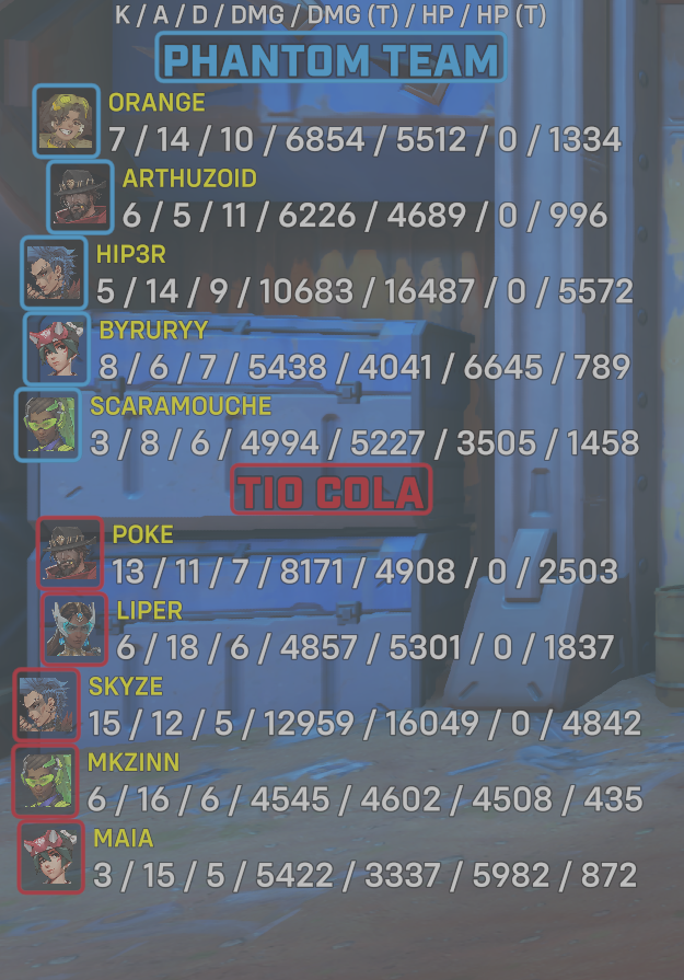 | Team | Player | Kills | Assists | Deaths | Damage | Damage (Taken) | Healing | Healing (Taken) |