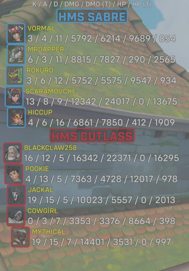 | Team | Player | Kills | Assists | Deaths | Damage | Damage (Taken) | Healing | Healing (Taken) |