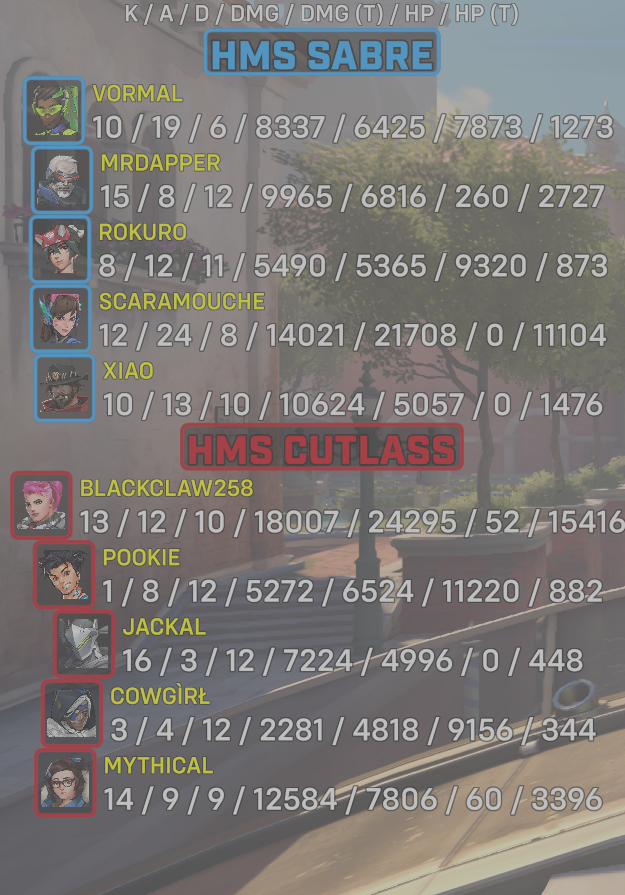 | Team | Player | Kills | Assists | Deaths | Damage | Damage (Taken) | Healing | Healing (Taken) |