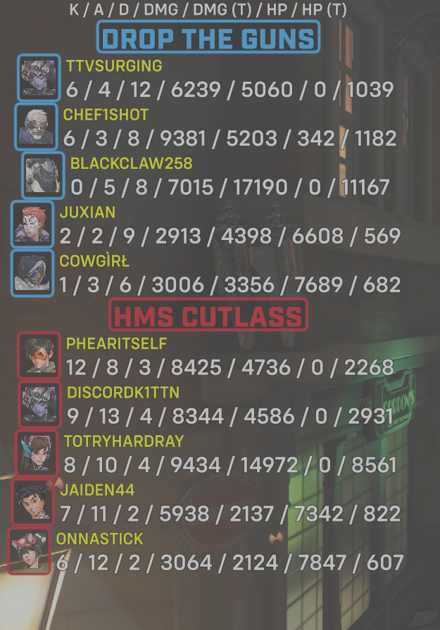 | Team | Player | Kills | Assists | Deaths | Damage | Damage (Taken) | Healing | Healing (Taken) |