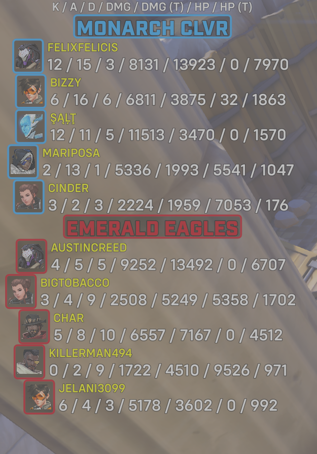 | Team | Player | Kills | Assists | Deaths | Damage | Damage (Taken) | Healing | Healing (Taken) |