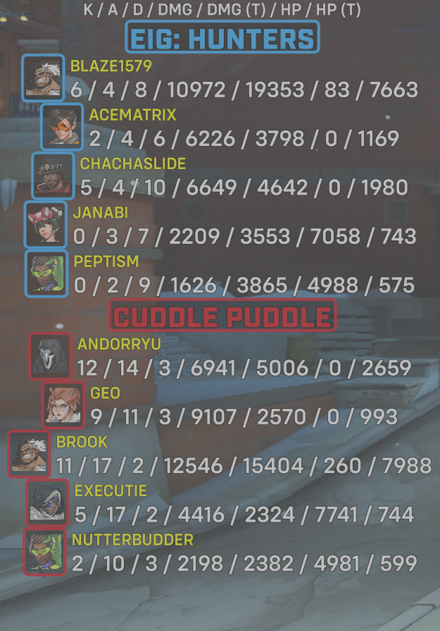 | Team | Player | Kills | Assists | Deaths | Damage | Damage (Taken) | Healing | Healing (Taken) |