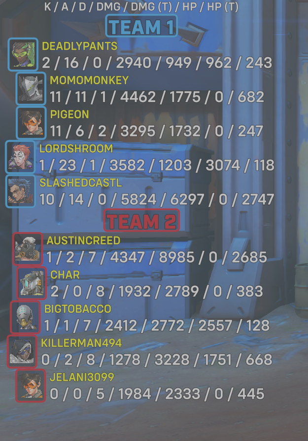 | Team | Player | Kills | Assists | Deaths | Damage | Damage (Taken) | Healing | Healing (Taken) |