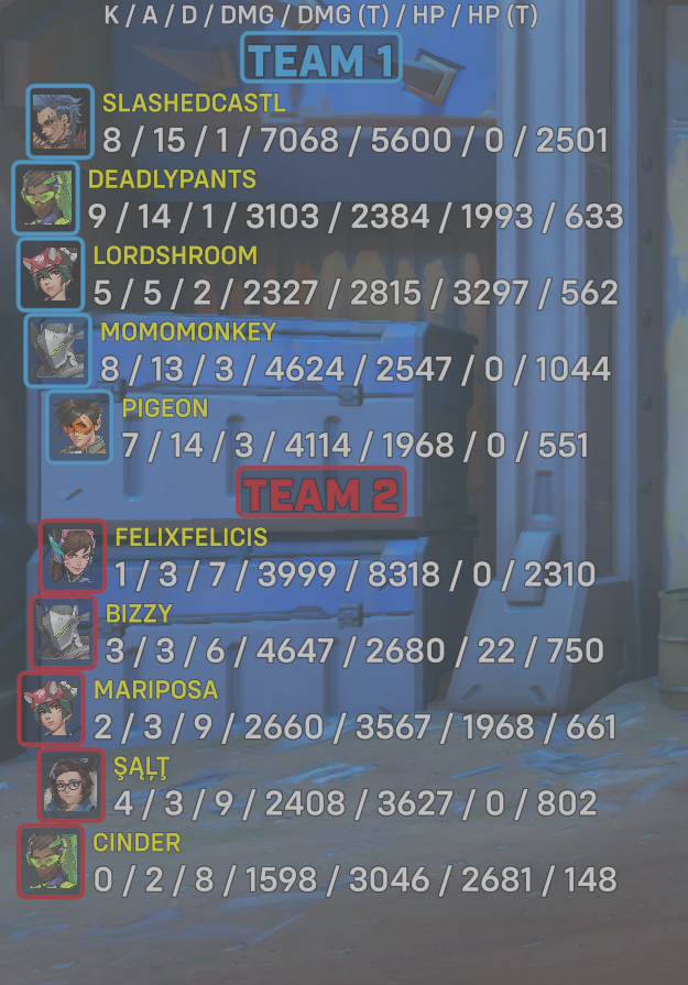 | Team | Player | Kills | Assists | Deaths | Damage | Damage (Taken) | Healing | Healing (Taken) |